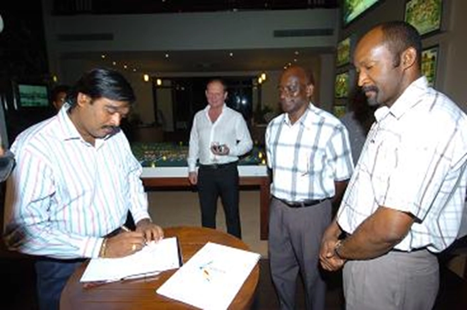 Craig Heeger of Eden Island and Ramu Pillay of Pillay R. Group each made R1 million pledge towards the trust fund. They then signed the pledge to become the first two diamond sponsors of Seychelles sports.